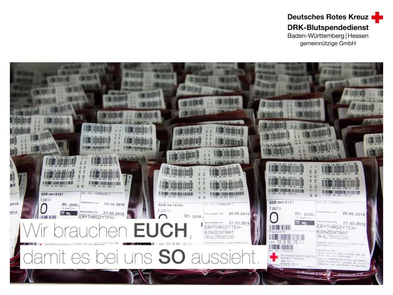 Blut kann man nicht künstlich herstellen! Damit wir genug Blut vorrätig haben, um Patienten in der Region bei Notfällen versorgen zu können, brauchen wir euch! Bitte kommt Blut spenden, damit unsere Regale nicht leer stehen.